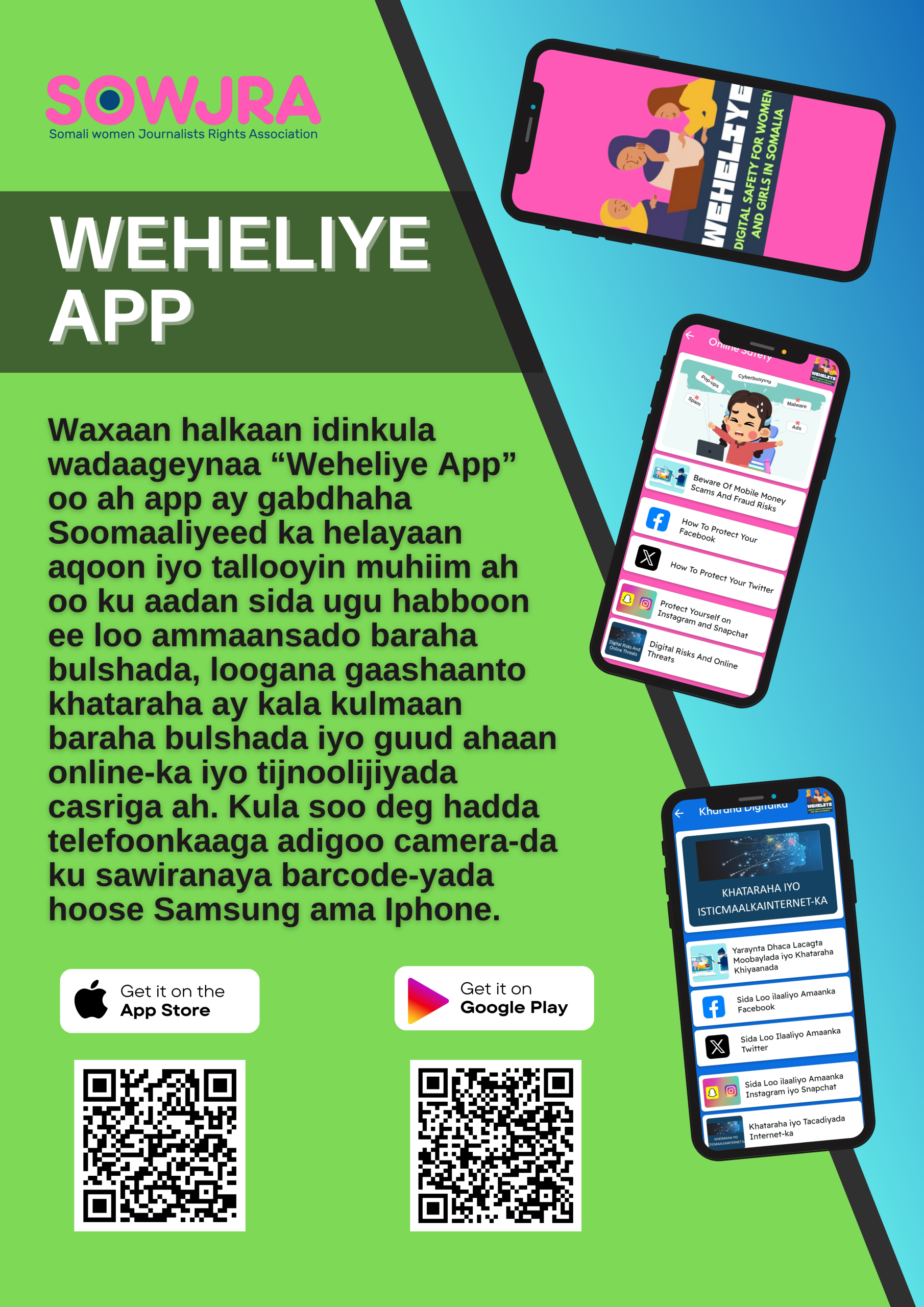 SOWJRA announced that the Weheliye App is now available on both the Google Play Store and Apple App Store. The app is free of charge and accessible to all Somali women — and anyone interested in learning about digital safety — who can easily download it anytime from either store.